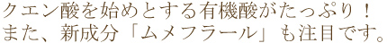 「クエン酸は梅などに含まれている「酸っぱさ」のもとです。他にもリンゴ酸やコハク酸、フマル酸、酒石酸、酢酸など多く含んでおりその中でも特に「クエン酸」が豊富です。梅肉エキスのクエン酸の含有量はレモンの約20倍も含まれています。